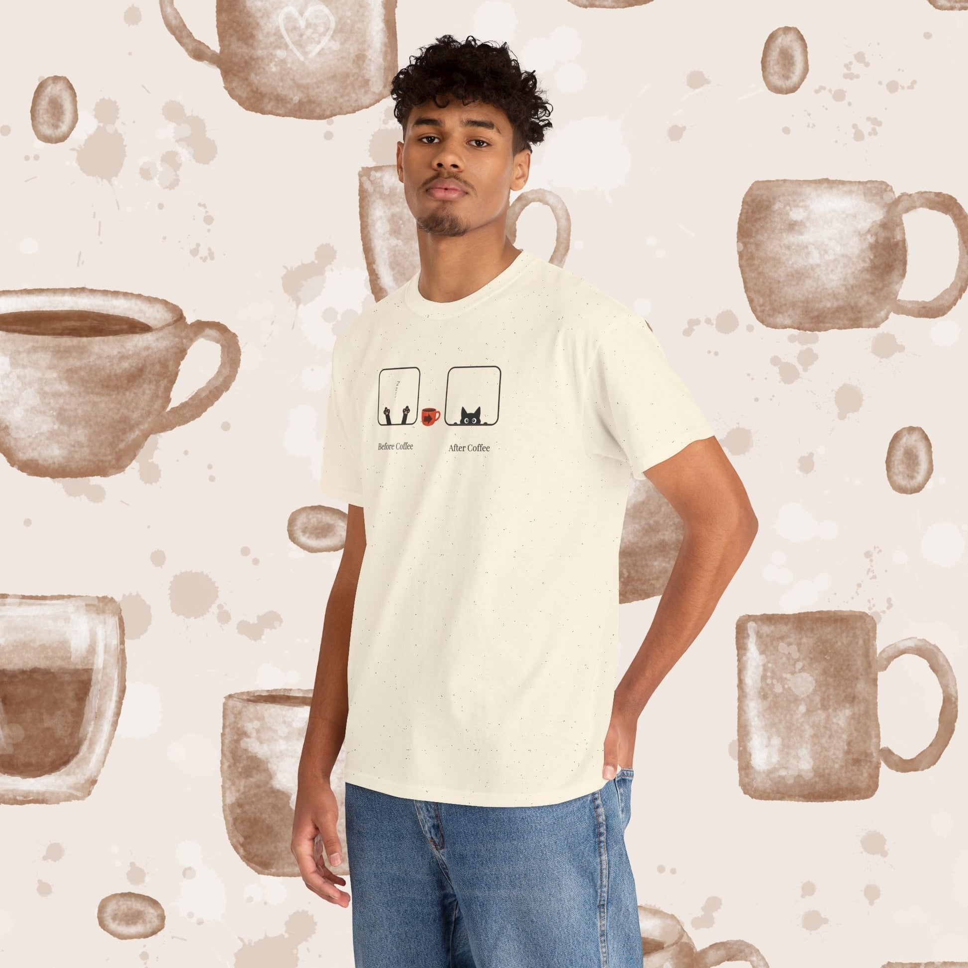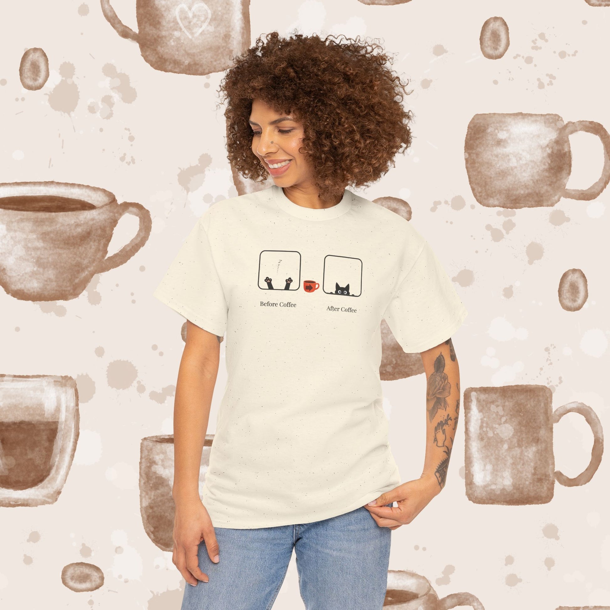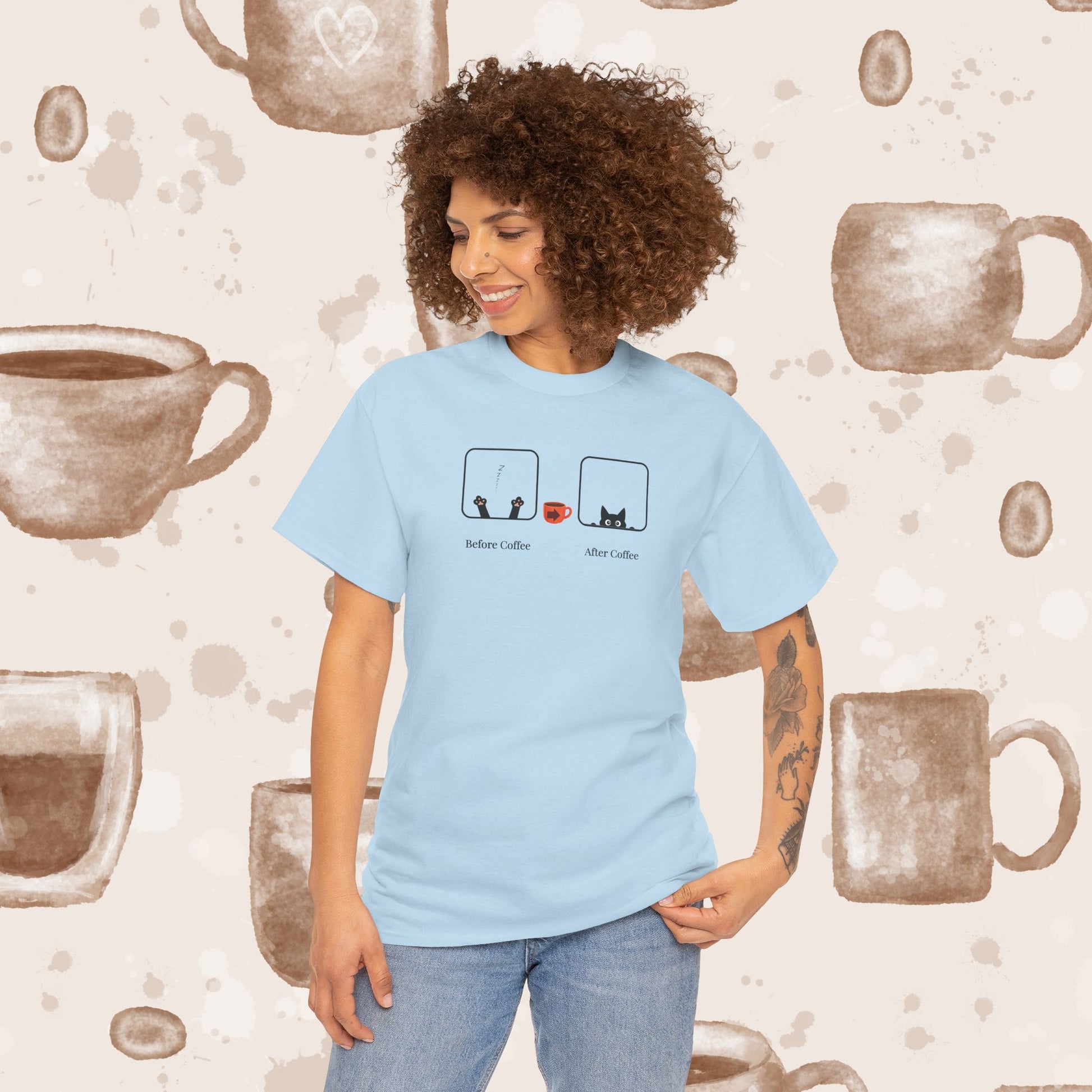 Two simple cat icons tell the whole caffeine story: on the left, a sleepy kitty with paws up, reaching for a steaming cup; on the right, the same cat wide‑eyed and alert. A tiny coffee cup with an arrow sits between them, and subtle labels read “before coffee” and “after coffee.” Clean, funny, and instantly relatable, this minimalist design is perfect for coffee lovers and cat lovers alike. A great everyday tee for anyone who transforms from snoozy to energized with that first sip.