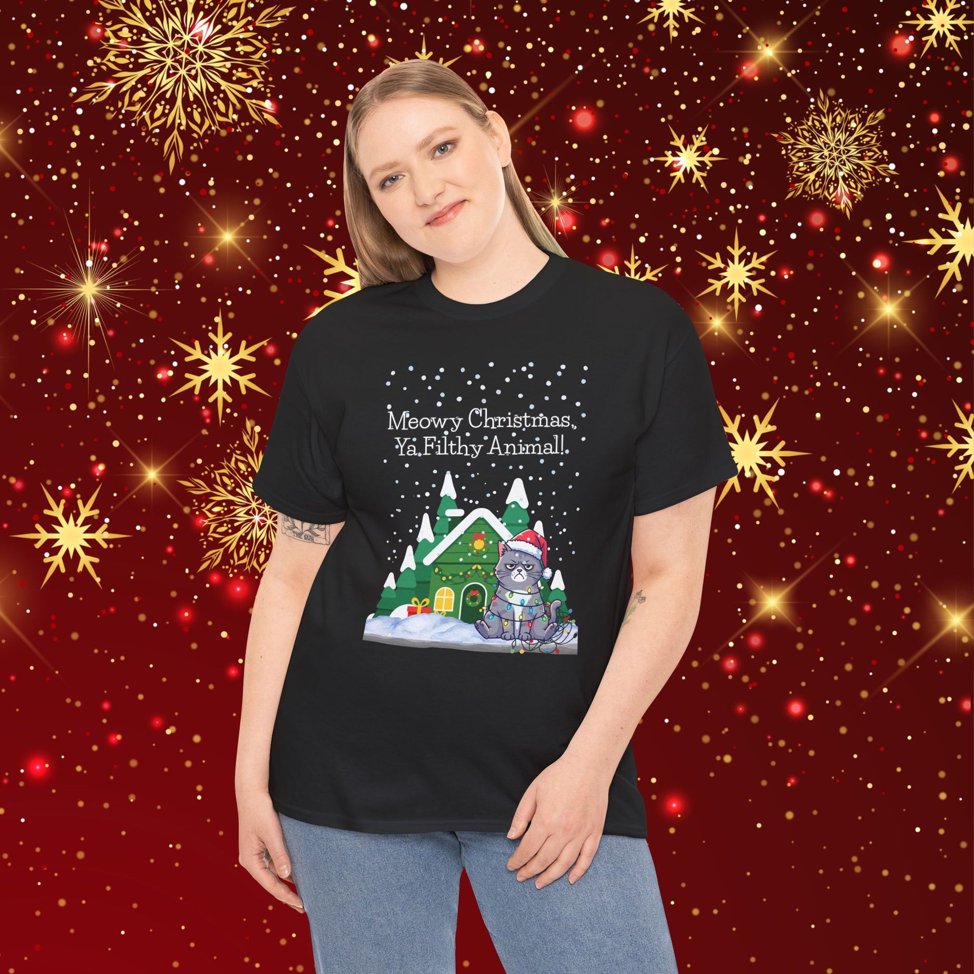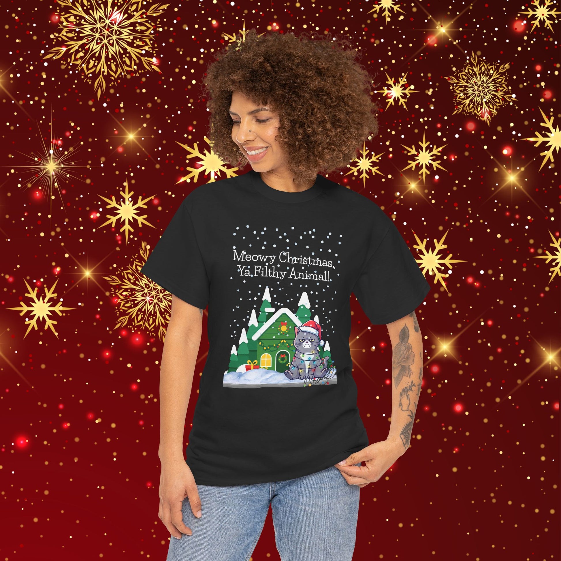 Christmas Cat T-Shirt — “Meowy Christmas Ya Filthy Animal” Holiday Tee