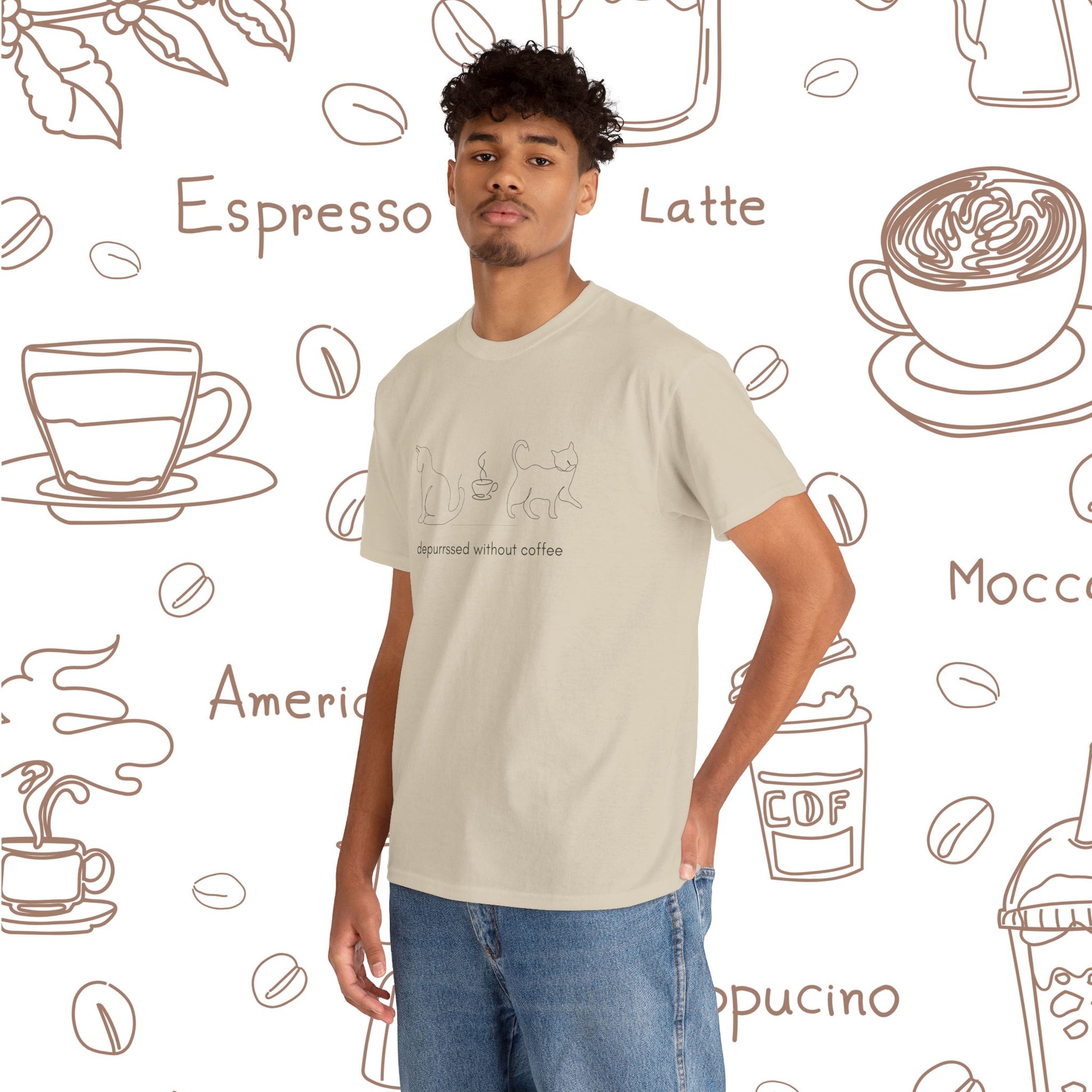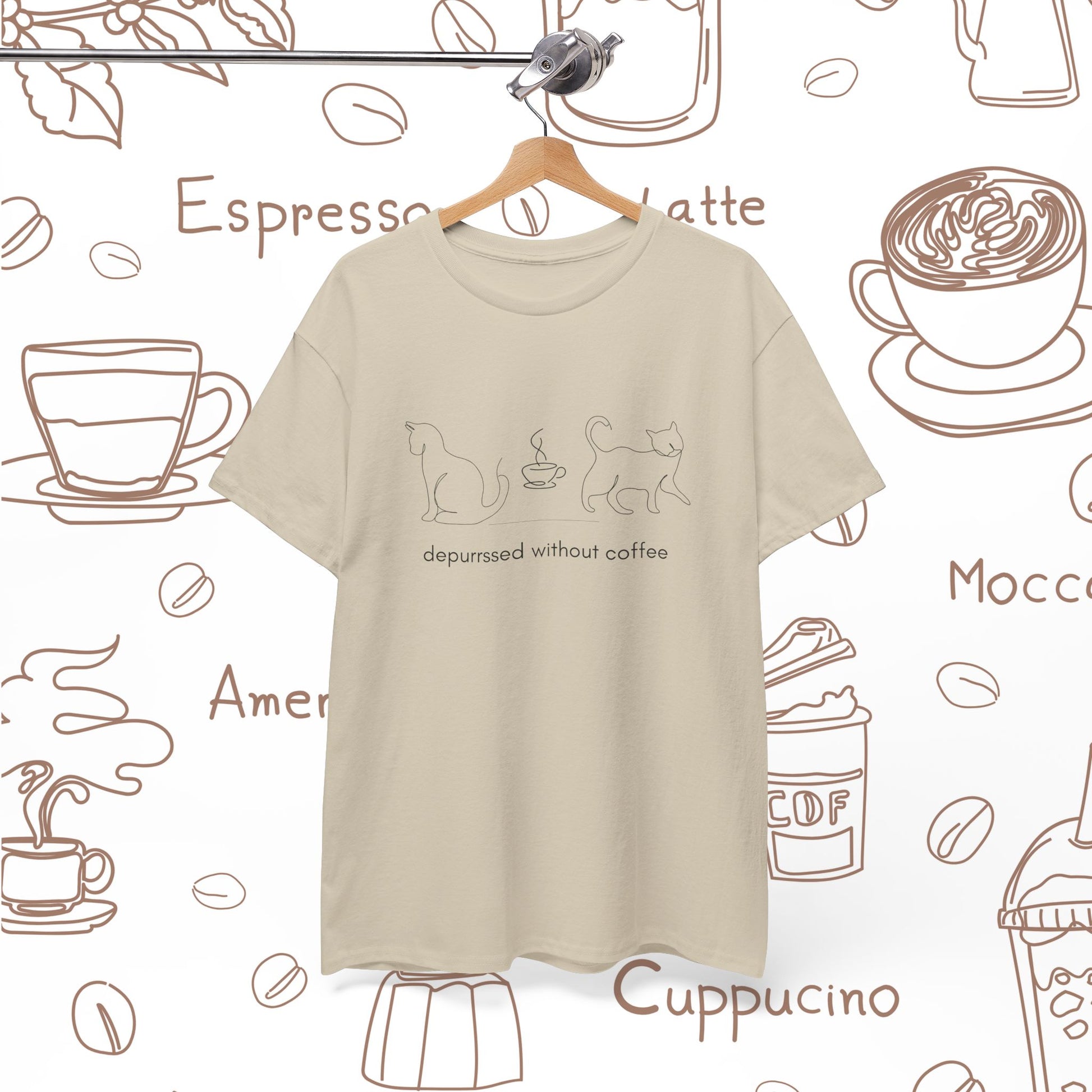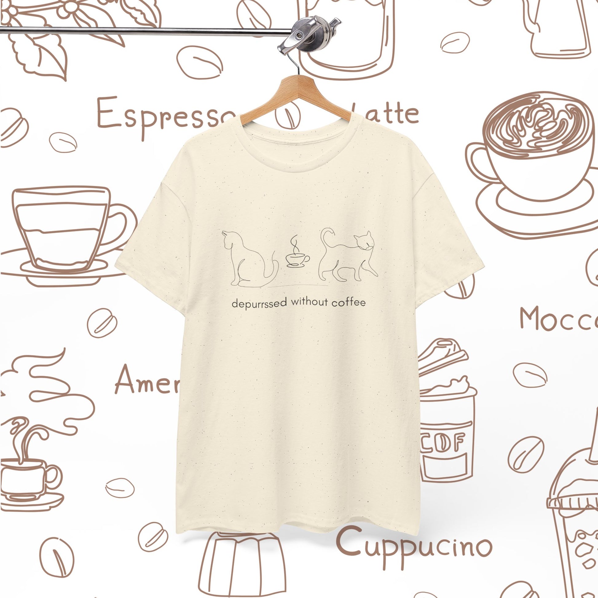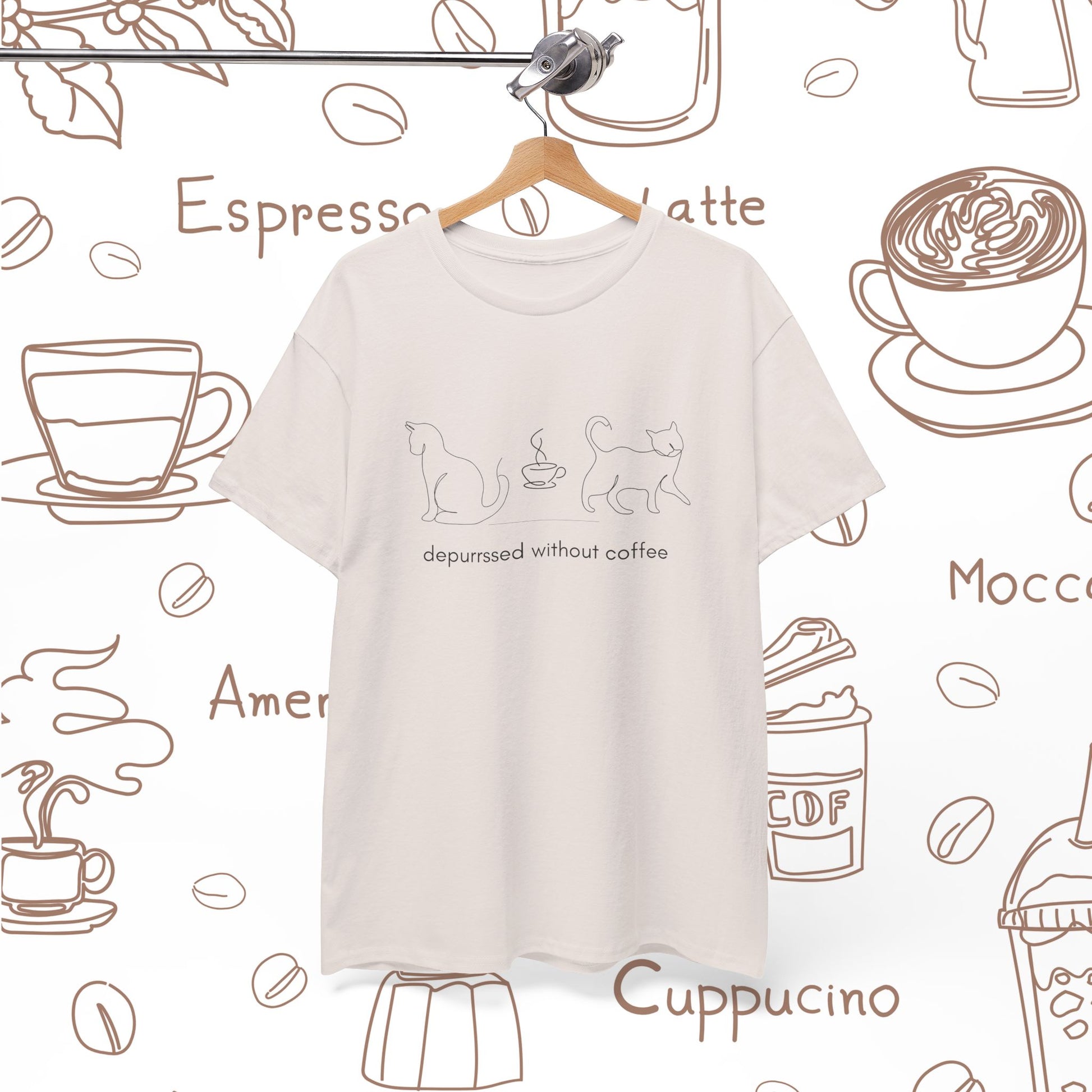 Depurrssed Without Coffee — Minimalist Caffeine Tee, Coffee Cat T‑Shirt
