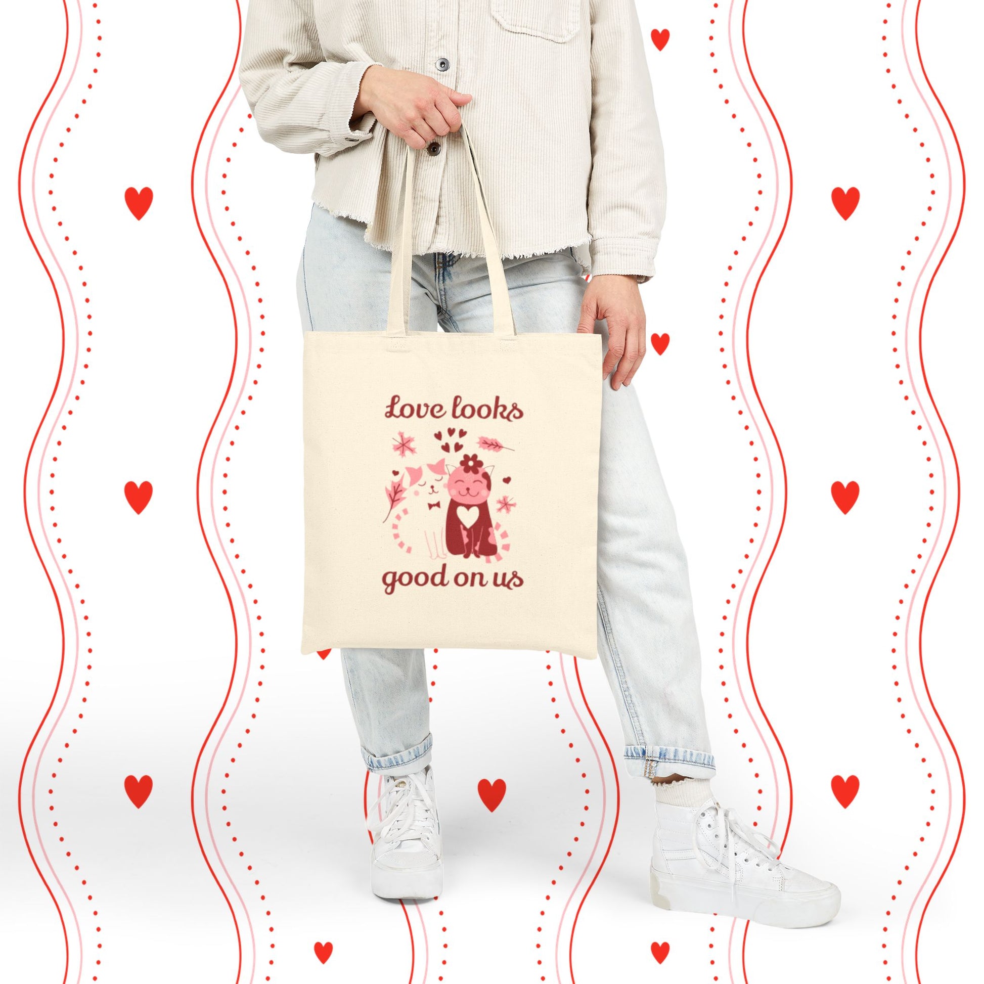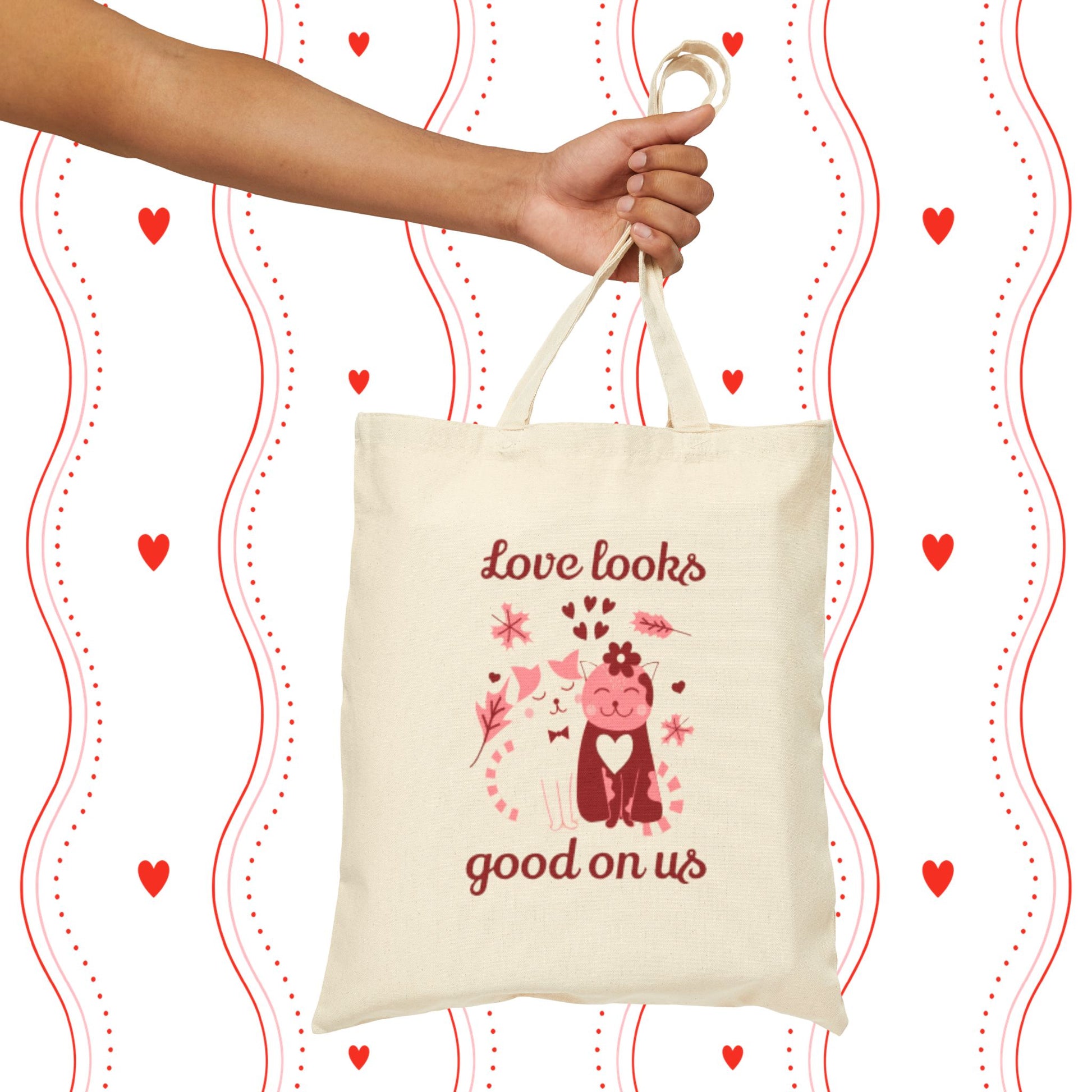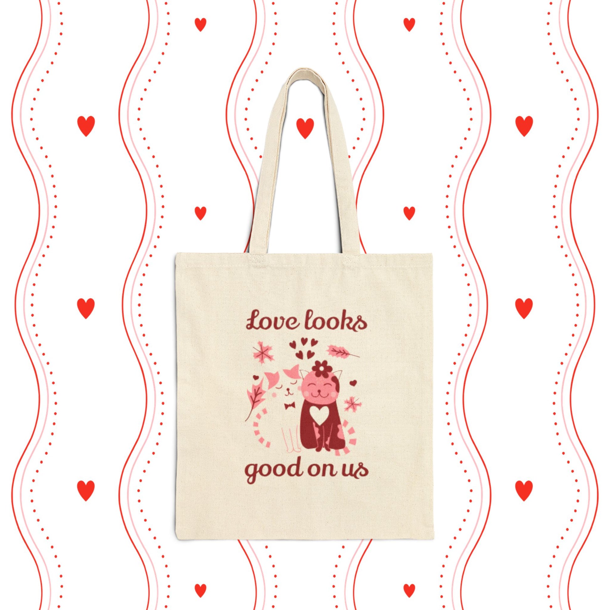 A sturdy cotton canvas tote that carries a warm, playful message: “Love looks good on us.” The natural canvas background and soft rose-and-scarlet print show a whimsical pair of stylized cats surrounded by hearts and leaves — a gentle, hand-drawn feel that reads like a little love note. Thick 12 oz cotton gives this bag weight and structure so it keeps its shape while holding books, groceries, or daily essentials. Reinforced self-fabric handles sit comfortably on the shoulder, and the flat-corner construction keeps the interior tidy. Choose natural for a light, organic look or black for higher contrast. This tote slips easily into everyday routines — for quick errands, cozy market trips, or as a sweet companion on date-day strolls — and it carries a quiet, affectionate vibe that resonates every time you reach for it.