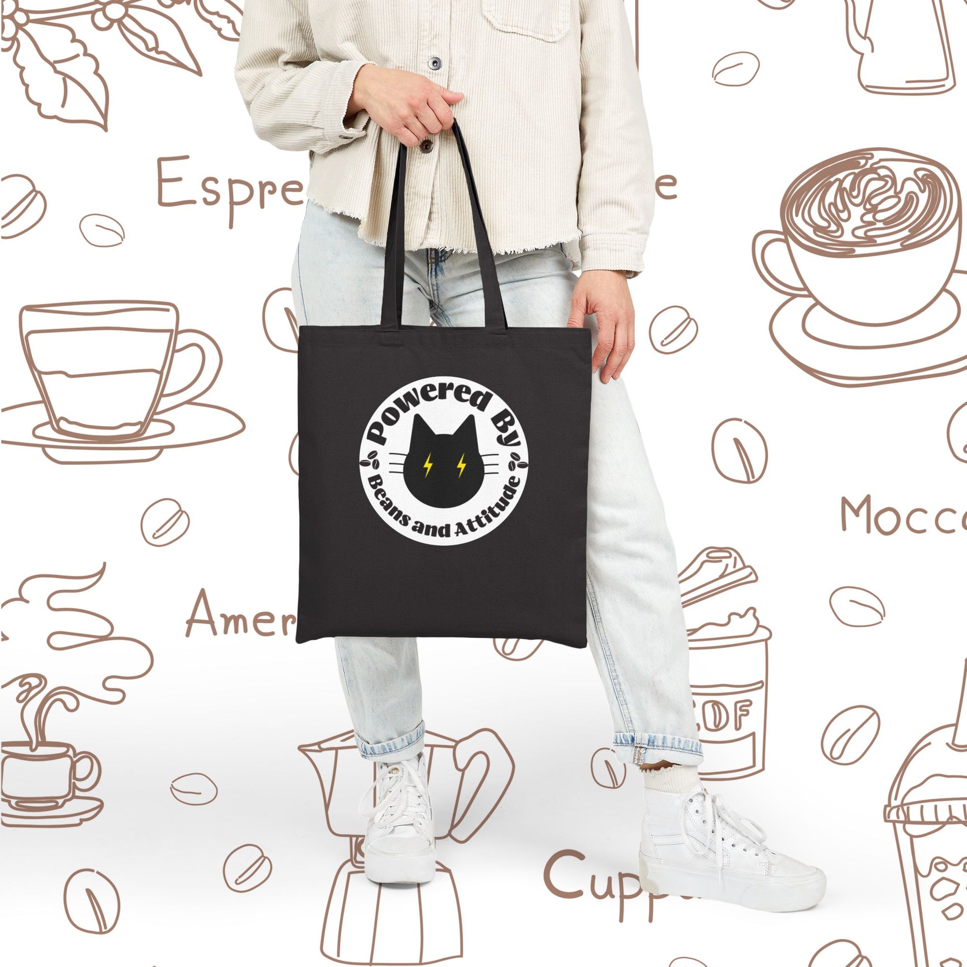 Powered By Beans and Attitude Tote Bag | Coffee Cat Illustration