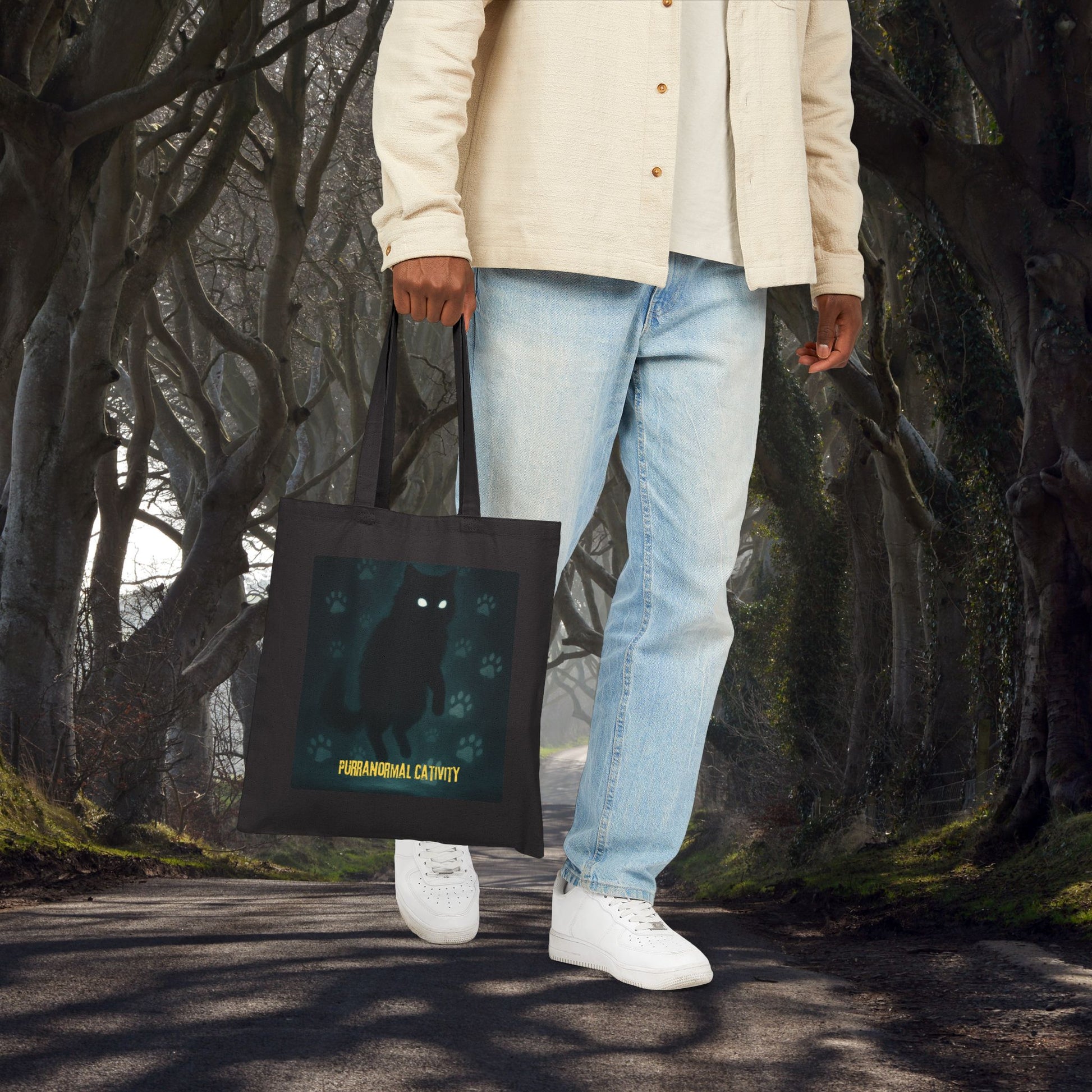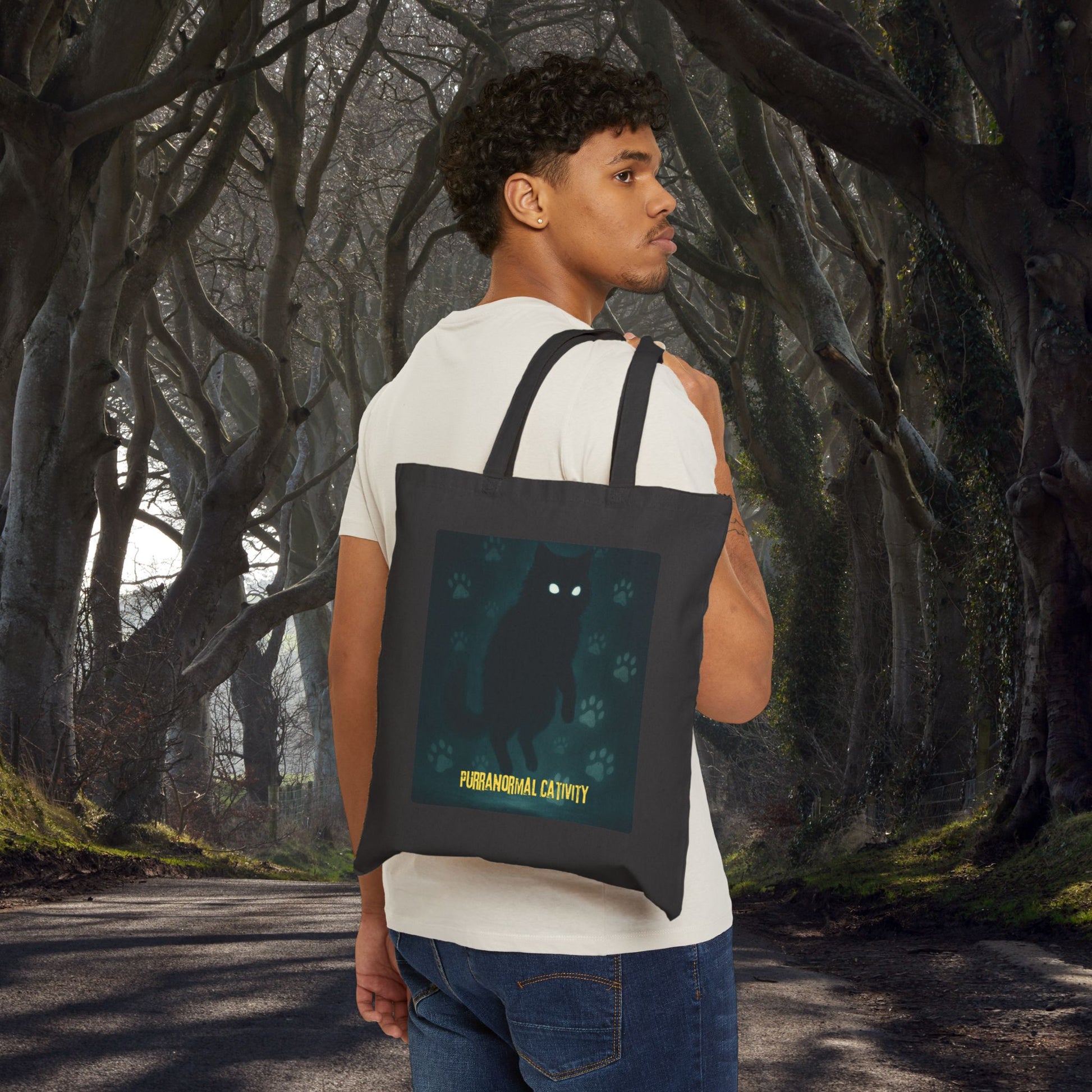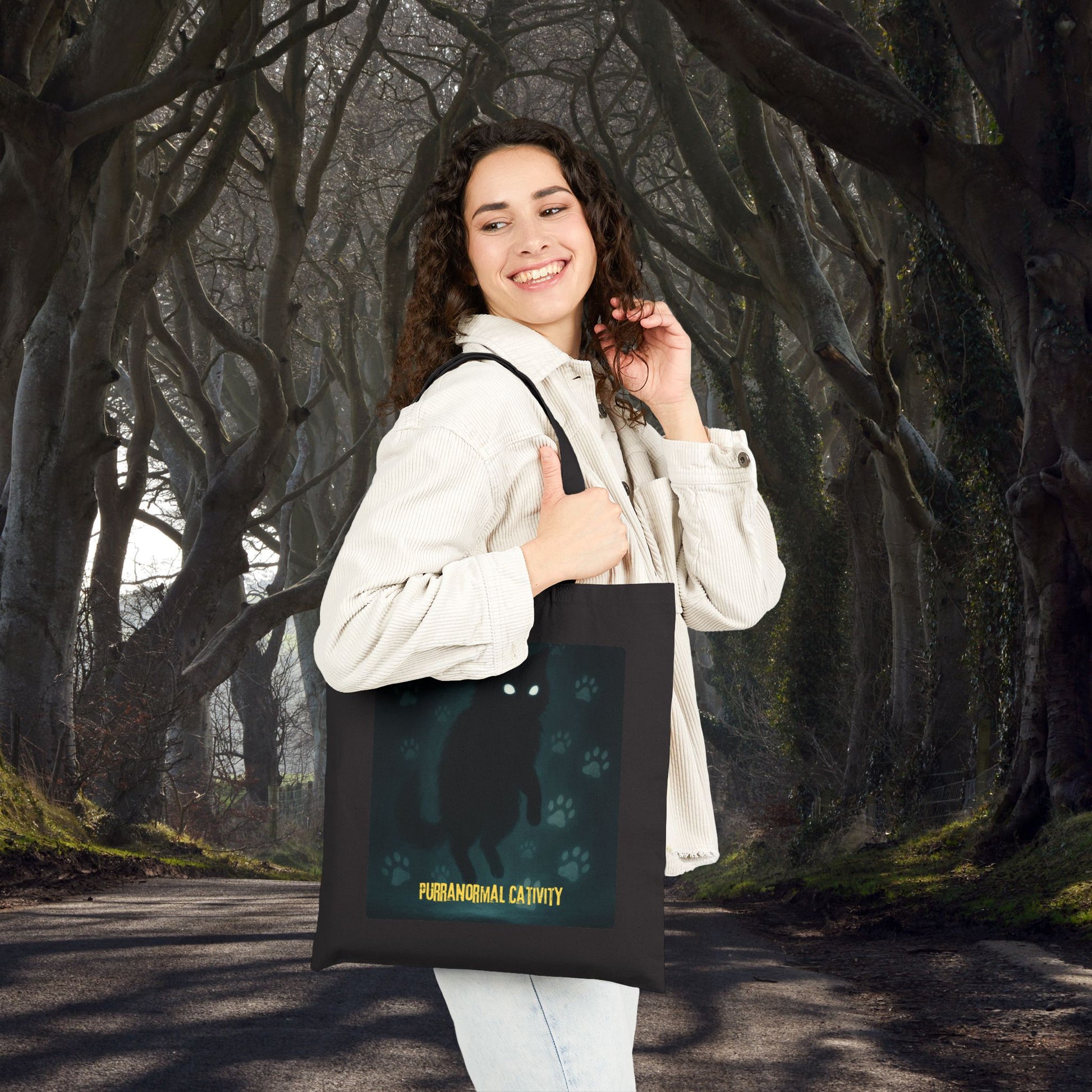 Purranormal Cativity Halloween Cat Cotton Canvas Tote Bag, Spooky Tote, Ghostly Shopping Bag, Eco-Friendly Trick-or-Treat Bag, Paranormal Cativity Bag