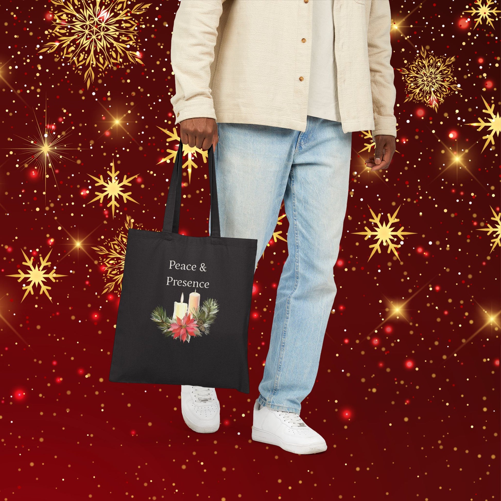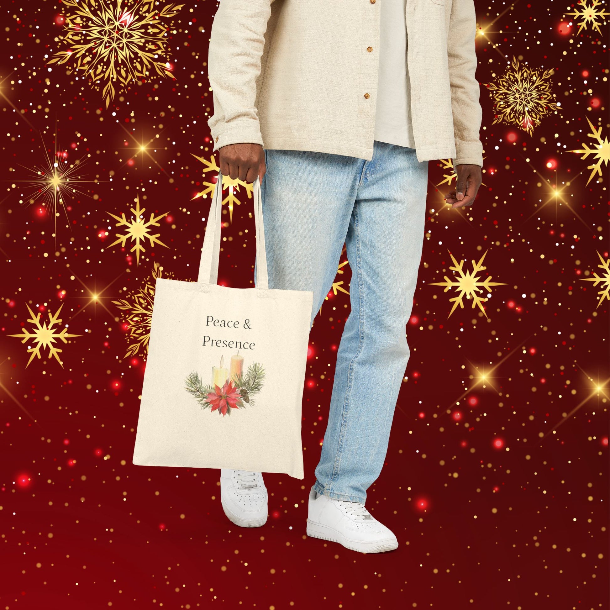 A timeless cotton canvas tote that carries a quiet, seasonal mood. The heavy 12 oz fabric holds its shape while softening with use. A muted holiday motif — candles, pine sprigs and a poinsettia — sits gently on the front with the words “Peace & Presence,” inviting calm while you run errands, bring baked goods to gatherings, or carry books to a winter market. Long self-fabric handles and reinforced stitching feel sturdy on the shoulder. Available in natural or black, this tote blends durable function with a restrained, cozy look that complements low-key seasonal moments.